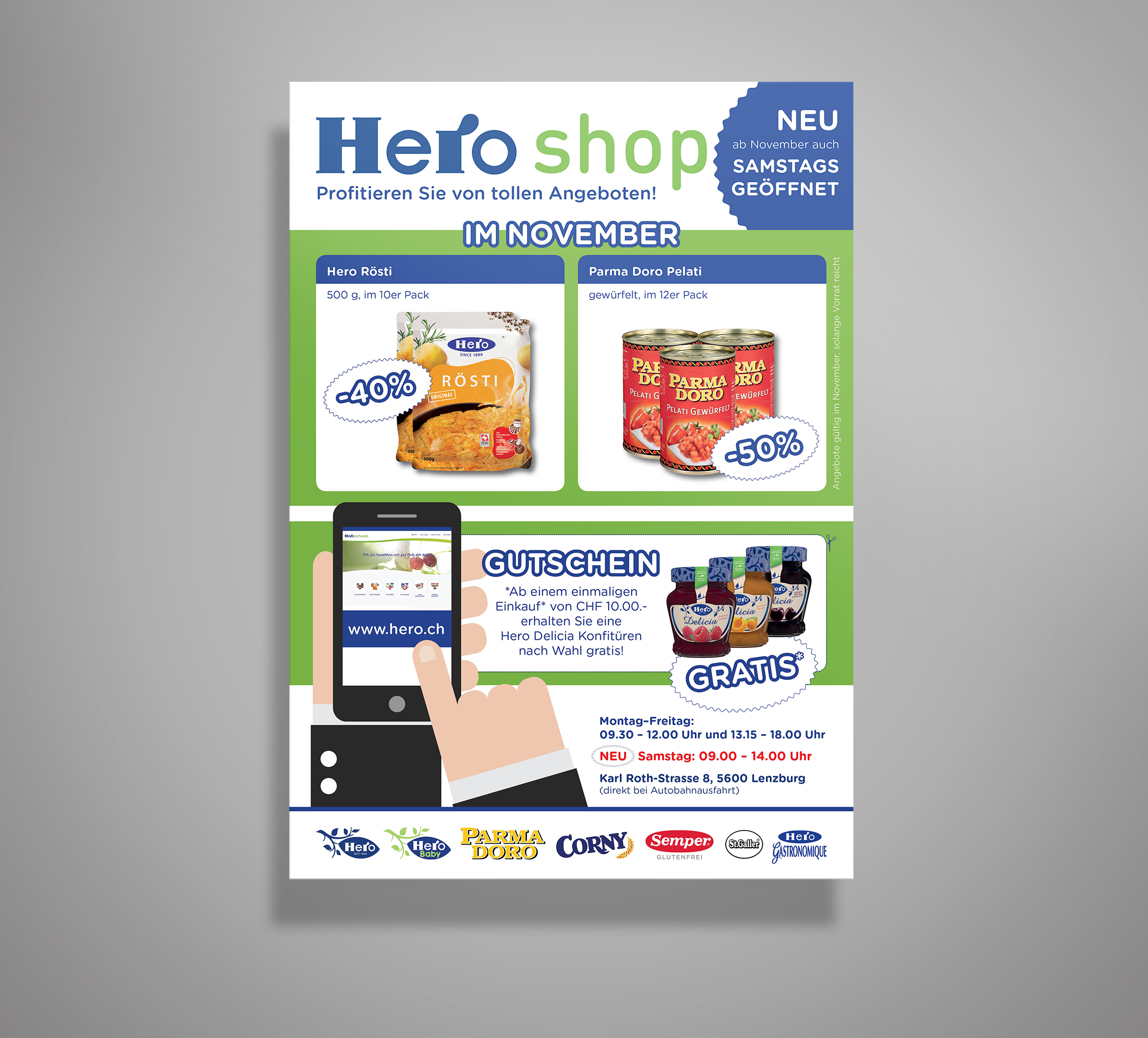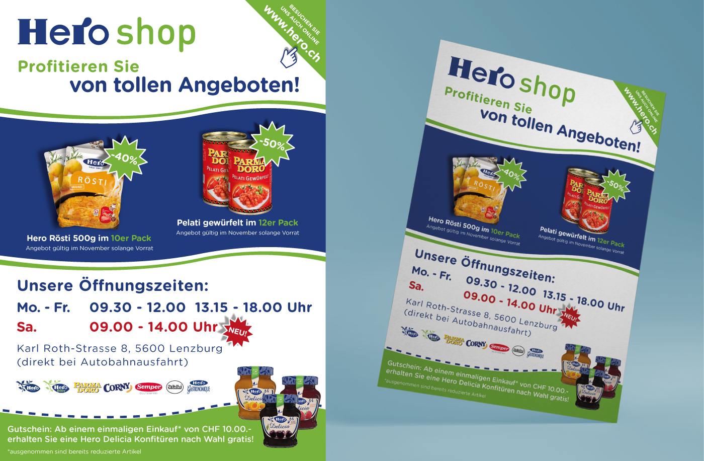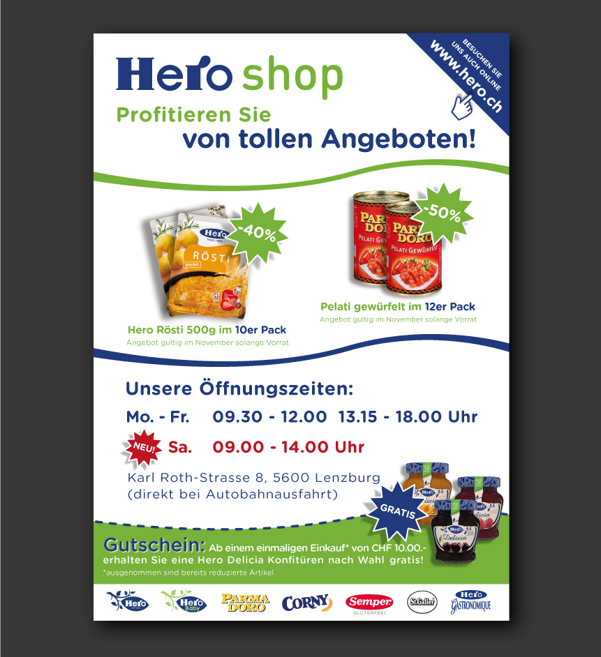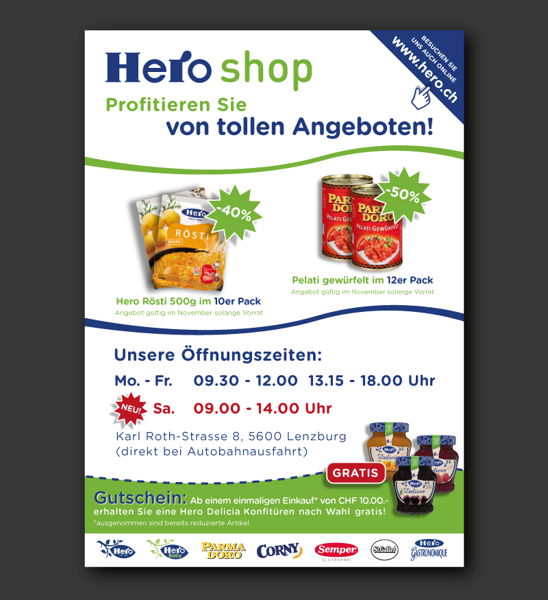 · Zudem soll der Link auf die Homepage www.hero.ch ebenfalls erscheinen.